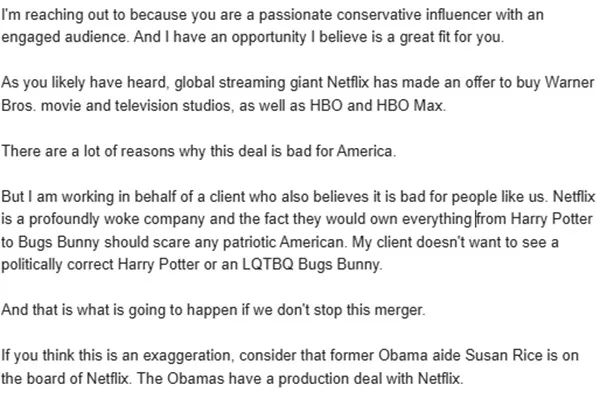 (A) reader email I received on Friday… came from someone who is a moderately popular conservative influencer, but also someone who has a strong sense of what he will and won’t for the cause. He had just received a unsolicited pitch from someone he didn’t know. A bland Gmail address and a name he had never heard before. But the subject of the email got his attention: