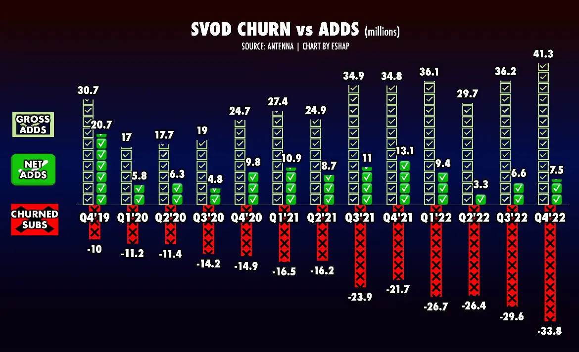 – In Q4 SVODs collectively acquired 41.3 mil new subs. They retained just 18%. The same in Q3.