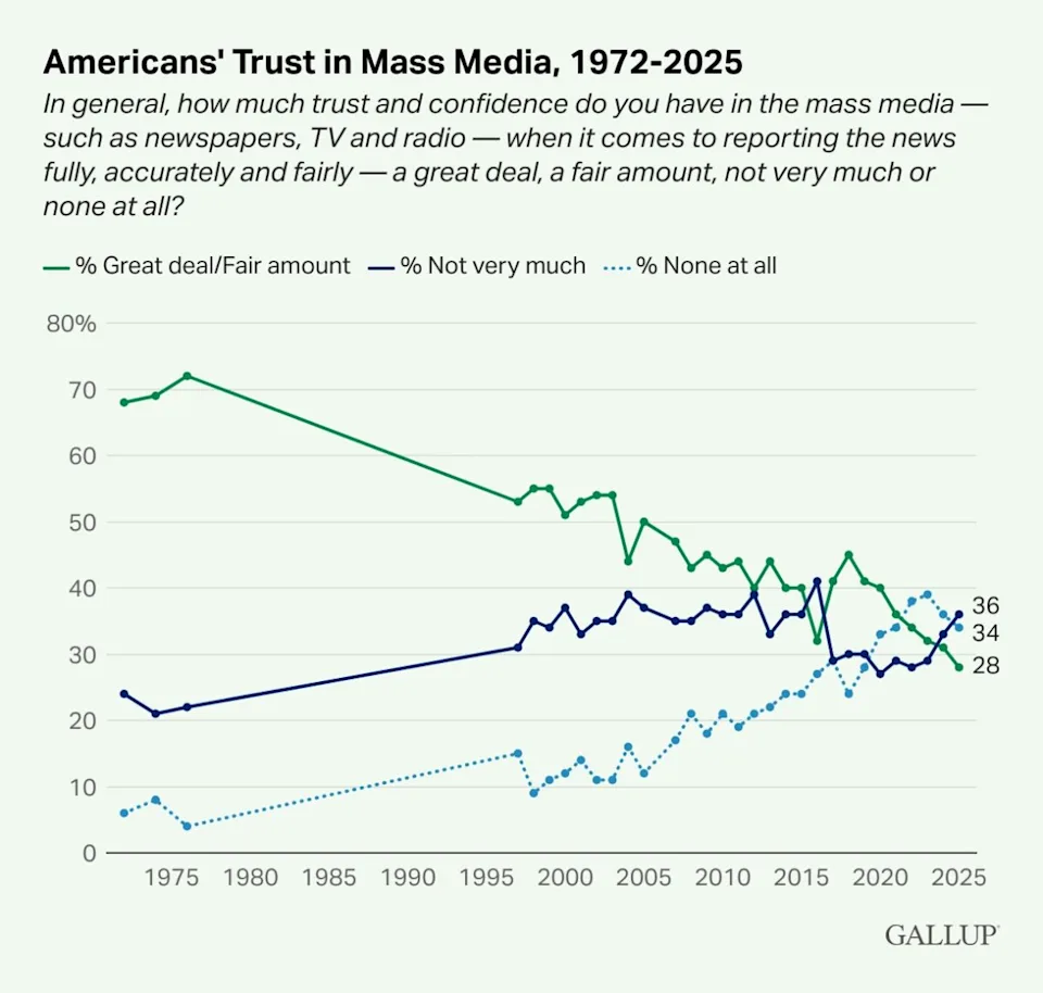 The specific question polled was, “In general, how much trust and confidence do you have in the mass media — such as newspapers, TV and radio — when it comes to reporting the news fully, accurately and fairly — a great deal, a fair amount, not very much or none at all?” Only 28% of Americans say they have a “great deal” or “fair amount” of trust in the media to report the news fully, accurately and fairly, the poll found — down from 31% in October 2024 and 40% in September 2020. This “marks the first time the measure has fallen below 30%,” according to Gallup.