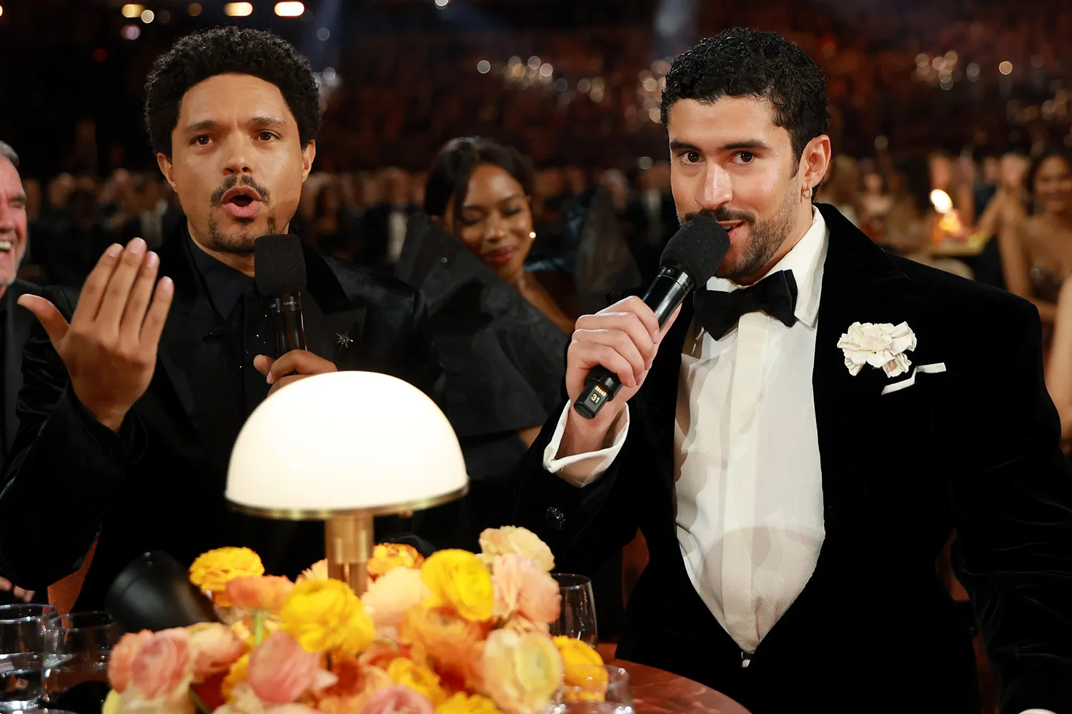 After continuously asking if Bad Bunny could perform…Noah convinced the Puerto Rican musician to sing a line from the title track of his album…as a salsa band made a grand entrance. Before the musician sang the lyric, Noah hinted at the song by translating the lyrics to English. “Wait, is that my song?” Bad Bunny asked with a smile….Noah said that he could not perform at the 2026 Grammys because of his “contract.” When Noah asked if Bad Bunny was “jealous” seeing other artists perform at the Grammys, he paused, before quipping, “No, maybe a little.”