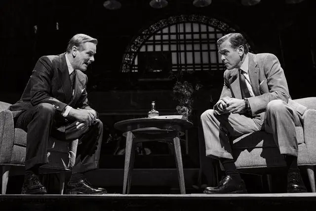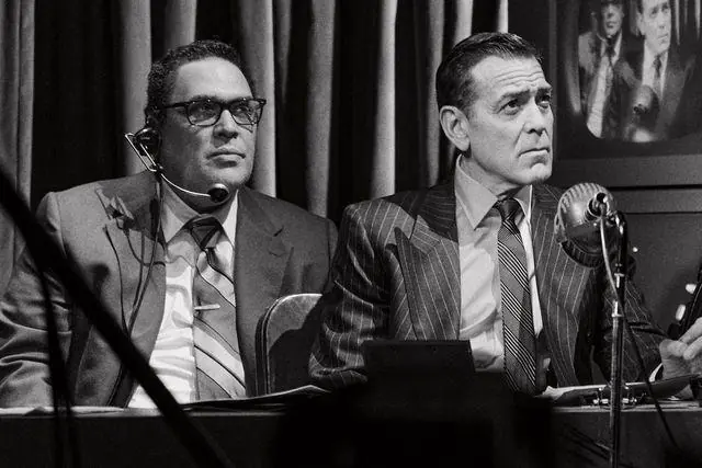 As a student of broadcasting history, the subject matter and staging were also compelling reasons to watch.  And with the network and Clooney’s approach to how this was shot, a viewer had the POV of a theatergoer.  Wide shots during transition scenes where a lounge singer would croon mood-appropriate songs of the mid-50s era which this takes place in showed how multiple sets on two tiers were interchanged through the show, with multimedia and modern big screens adding to the intensity when appropriate.  The play, as was the 2005 movie, is set around Murrow’s crusade to investigate the notorious Joseph McCarthy, the leader of the Red Scare that ultimately blackballed numerous entertainers of the era having any association with anyone with the remotest ties to Communism.   This time around, having aged into the role of the grizzled, chain-smoking champion of CBS News in an era before Walter Cronkite, Dan Rather and even Scott Pelley,  Clooney has the lead role, ceding the role of his producing partner, Fred Friendly (who eventually rose to become president of CBS News), to a larger-than-life and emotionally investing Glenn Fleshler.  There’s also some wonderful portrayals of other familiar names out of broadcasting history, including Emilio Madrid as the  generally supportive but ultimately bottom-line driven owner/founder of the Columbia Broadcasting System, William S. Paley.
