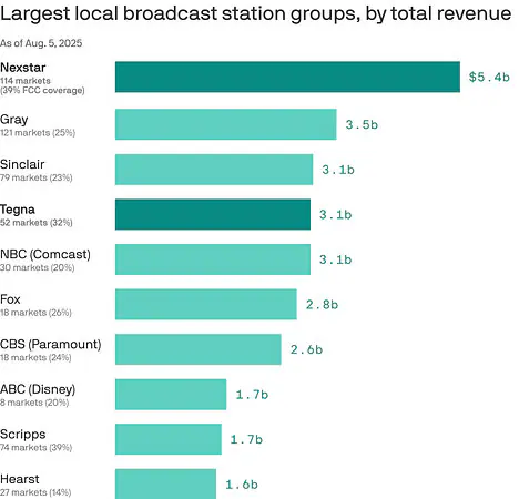 If you live in a big coastal elite city you may not be familiar with them. Their largest current market is Atlanta, and they are losing their CBS affiliation there on Monday, when New Paramount claws back that asset to its thankfully digitally renumbered station known as legacy Channel 69. Feel free to insert your own punch line there. But what this chart from AXIOS Media Trends reveals is that not only does Gray currently reach more different markets than any other major broadcaster, they’re also generating more revenue than all but one of them.