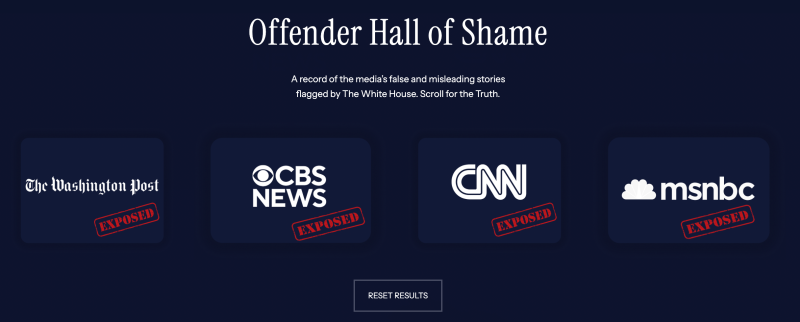 Amidst the tragic shooting of two West Virginia National Guard members in DC on November 26 and a flurry of Truth Social posts and more attacks on Joe Biden’s legacy Friday from the ex-Apprentice host, the Executive Branch launched a digital pummeling of “the Media Offender of the Week.” Promising to chronicle a “record of the media’s false and misleading stories flagged by The White House,” the page also offers a detailed “Hall of Shame” going back months. It also urges vistors to “Scroll for the Truth.