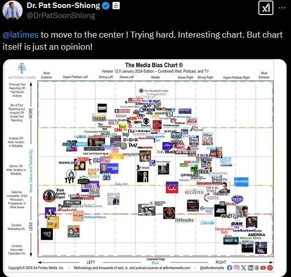 Earlier this week L.A. TACO’s Hadley Tomicki dropped a fairly thorough timeline of the past 13 months of the evolution of both Soon-Shiong and the TIMES, beginning with last January’s round of layoffs that resulted in the resignation of editor Kevin Merida. After a relatively quiet spring and summer, things began to heat up as the presidential election drew nigh, and really peaked when Soon-Shiong refused to follow the recommendation of his editorial board to endorse Kamala Harris. Subsequent to the re-anointing of Fat Orange Jesus by a plurality of Americans who weren’t too lazy to actuall vote, Soon-Shiong reaffirmed his personal motivation to make the paper more “fair and balanced”–or at least as the likes of Roger Ailes once defined it. Tomicki took particular note of one mid-December X-eet: