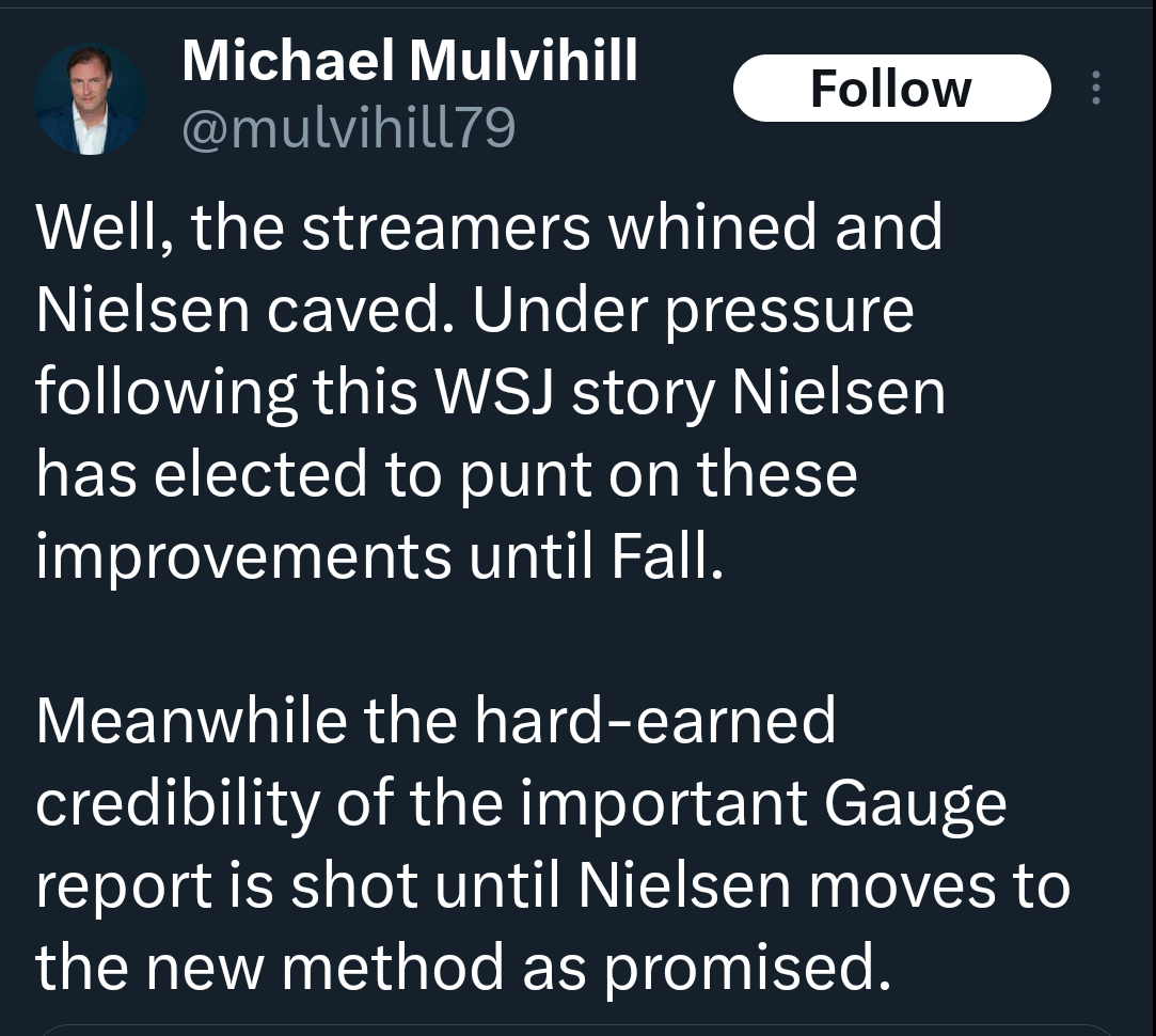 As regular readers of these musings should know, I haven’t been all that thrilled with the posturing and shenanigans that seem to be all the more frequent with the management team that’s been in place since the last time the company went private. Long-promised rollouts and updates to interfaces and methodologies that have aged about as well as the clientele at my one-time fave eatery went unaccredited and pushed back even as legitimate competitors emerhged. The ever-insightful Evan Shapiro devoted a decent chunk of yesterday morning’s MEDIA WAR AND PEACE newsletter to how the last five years and change–pretty much the entire streaming-first era–have played out. If you can divorce yourself from the fact that it revolves around an awful lot of stuff that is anything but sexy, it’s a fascinating read. If you happen to be someone who ultimately is impacted one way or another by all this, it’s actually frustrating with a capital F, which is the same initial of the word I’ve often exclaimed when I was dealing more directly with Nielsen.