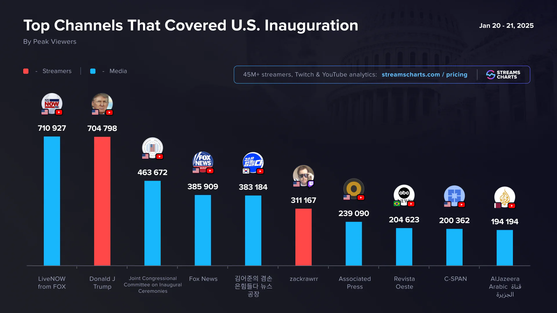 Millions of viewers tuned in live on Twitch, YouTube, and other streaming platforms to watch the inauguration. Streams Charts tracked which channels attracted the largest audiences during the event. Thanks to the inauguration, some popular streamers even set new personal viewership records.