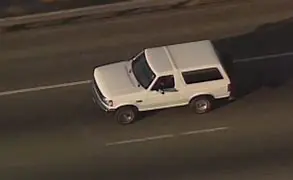 Sure enough, the infamous white Bronco, along with a caravan of slow-moving police cars and a covey of news and police choppers, passed right in front of us.  Our synagogue was right on the route A.C. Cowlings took back to the Rockingham estate.  We distinctly saw Simpson in the back of the Bronco, with a shadow of the gun he held at his head clearly visible.