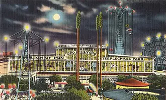 On July 1, 1965, Trump purchased Coney Island’s recently closed Steeplechase Park for $2.3 million, intending to build luxury apartments.[64][65][66] The next year, he announced plans for a 160-foot-high (49-meter) enclosed dome with recreational facilities and a convention center.[67] At a highly publicized ceremony in September 1966, Trump demolished the park’s Pavilion of Fun, a large glass-enclosed amusement center.[68][69] He reportedly sold bricks to ceremony guests to smash the remaining glass panels, which included an iconic representation of the park’s mascot, the “Funny Face“.[70][71][72] The next month, New York City announced plans to acquire the former park grounds for recreational use.[73] Trump filed a series of court cases related to the proposed rezoning, ultimately winning $1.3 million.[66] After the site laid vacant for several years, Trump started subleasing it to a manager of fairground amusement park rides.[68][66]