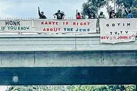 His opinions aside, he is a talented and gifted musical artist. He makes a LOT of money for companies that carry his music. And yes, more recently, his choice of apparel has gotten significant sales from some opportunistic entrepreneurs. And you might be right that some of the people that chose to hang a disgusting banner over the 405 Freeway, very close to where the University of Judiasm sits in Los Angeles, might have purchased something. I say you might be right, because at least I don’t talk to people like that, and I suspect you don’t either, or at least won’t admit it here.