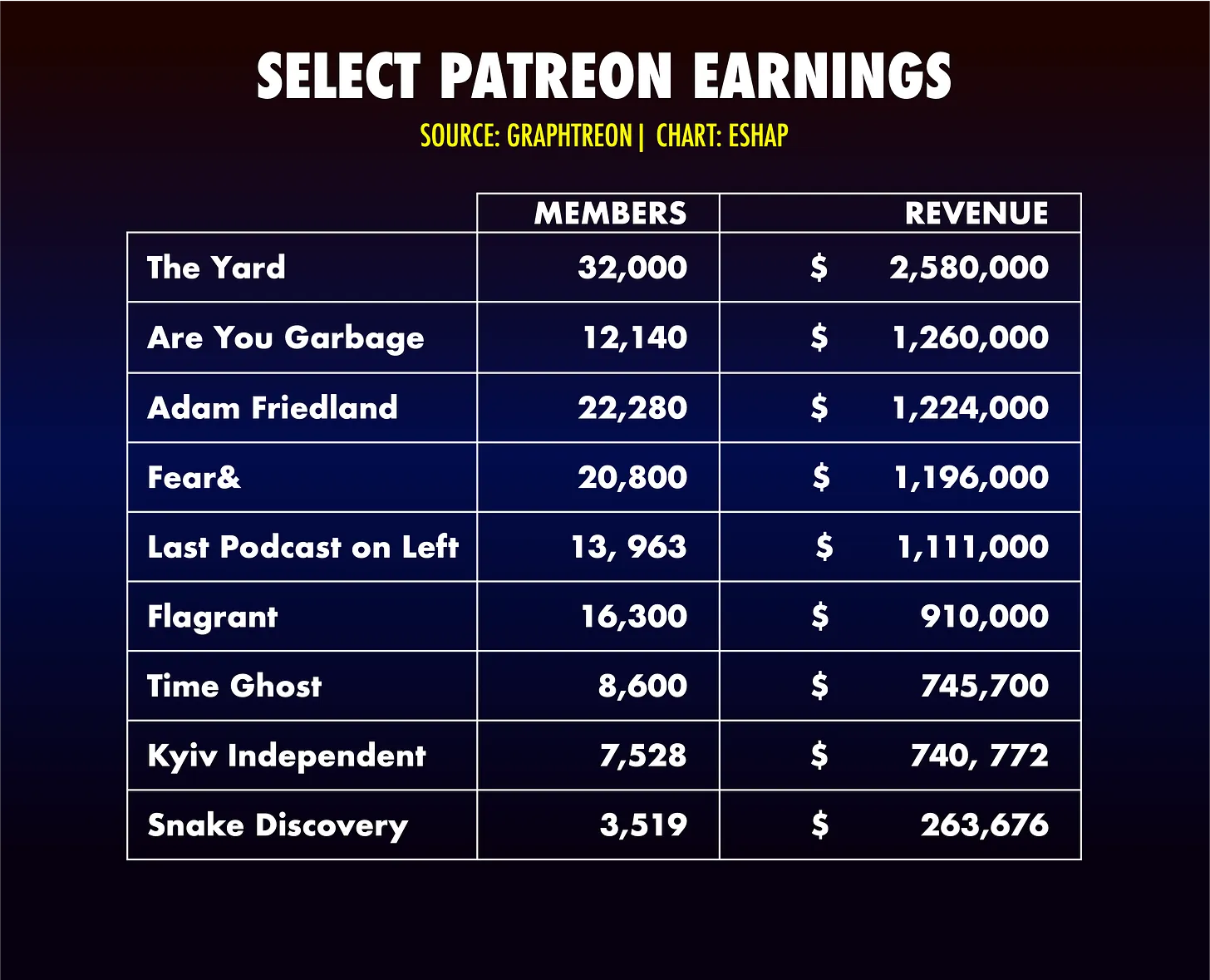 The list above includes one of the most popular Patreon publishers, The Yard, as well as numerous other Patreon creators with far fewer feed subscribers. The Last Podcast On The Left is not a Top 100 podcast. They have fewer than 14,000 Patreon members. Their Patreon will generate more than a $1 million this year. That’s on top of whatever revenue they generate from podcast ads, merch sales (which they do a lot of), and touring revenue. Snake Discovery is a YouTube series about reptiles. It’s also a pet shop in Minneapolis. They have 3 million subs on YouTube. They have 3,500 Patreon members. This year, they will generate more than a quarter of a million dollars from Patreon memberships, on top of their merch (which they sell a lot of) and various other sources of income.