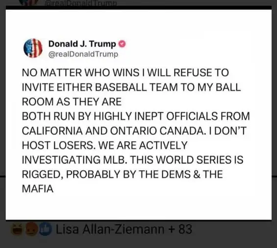 The latest such emotional overreaction has come from a number of lifelong Los Angeles Dodgers fans who had declared they are no longer capable of rooting for the team to win the World Series they are currently engaged in. Mostly because they chose to accept an invitation from the current resident of that owner-builder renovation at 1600 Pennsylvania Avenue last year, and now that it’s down to one wing it’s sacreligious to even think of setting foot inside it. When this image began to appear in numerous feeds yesterday there were sighs of relief that they now could “safely” resume their support.